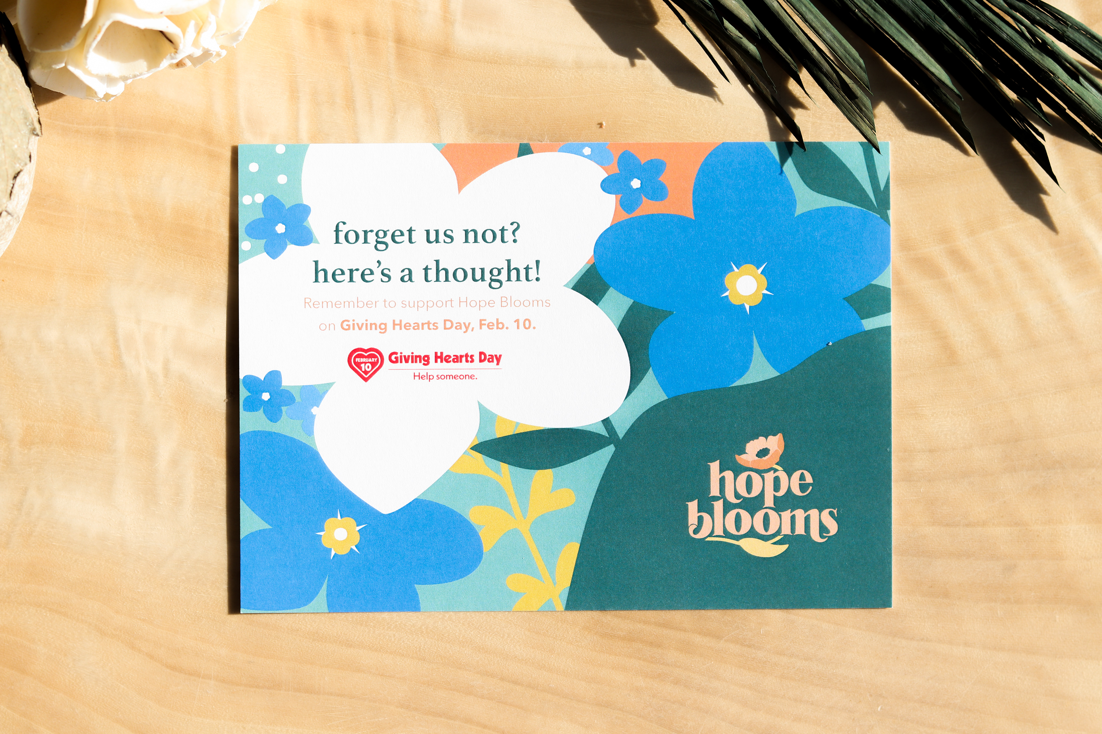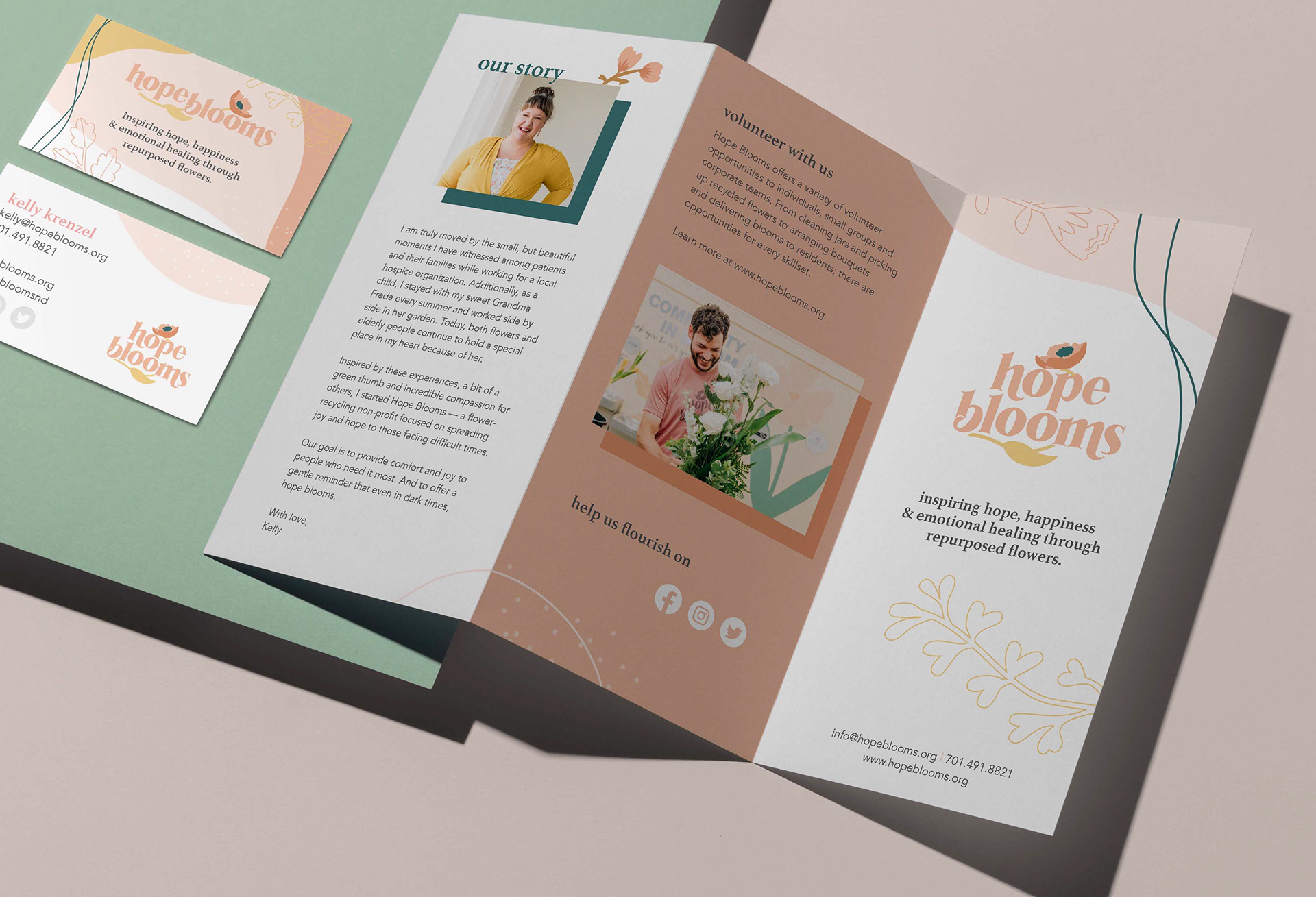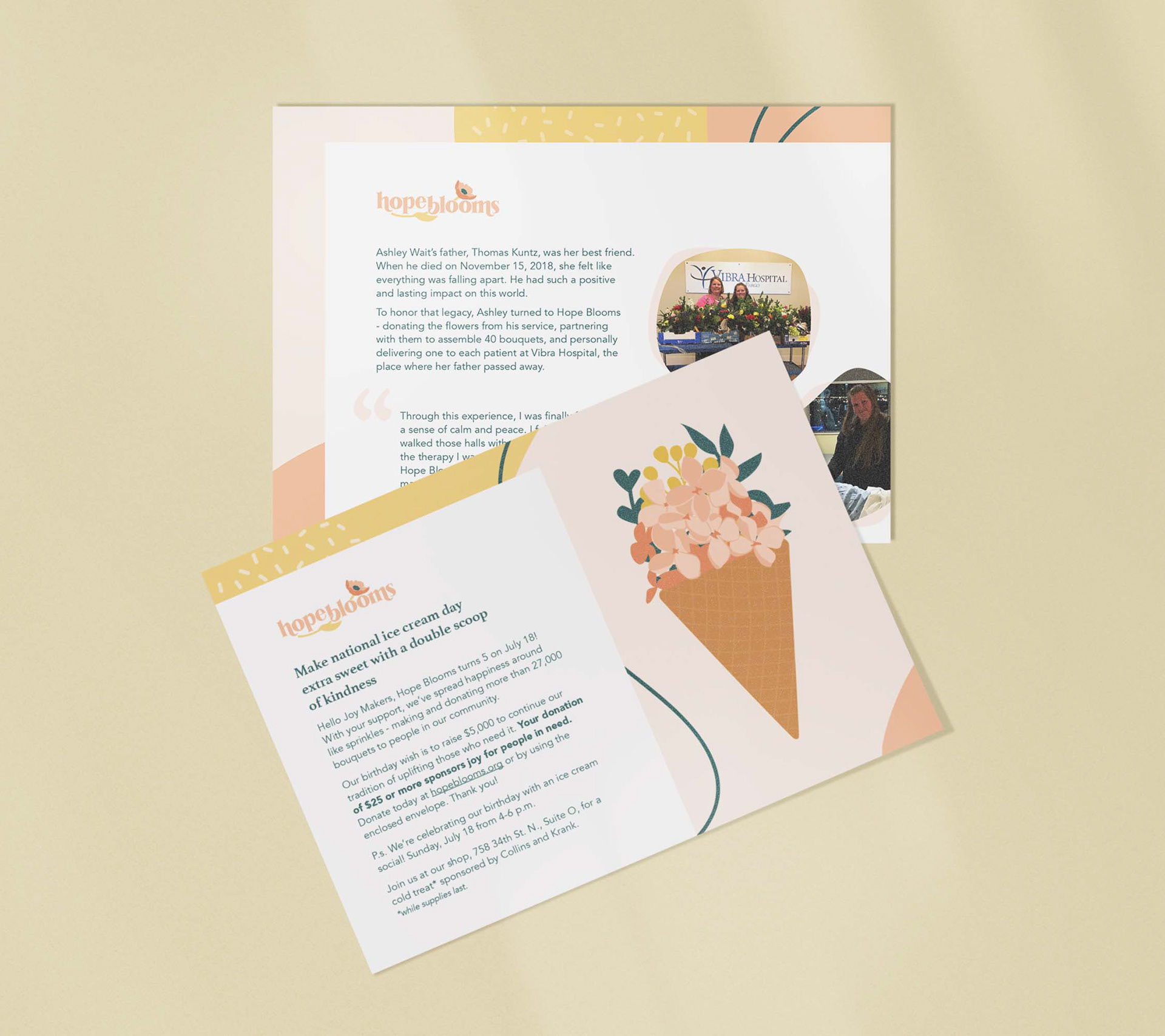 Hope Blooms is a local nonprofit with a mission to bring joy to those in need by repurposing bouquets. My first project as a volunteer designer in 2019 was the design and painting of a mural for their volunteer shop. Since, I've designed graphics for their annual Giving Hearts Day campaigns, birthday celebration campaigns, various social media graphics, and updated print materials to showcase an evolving brand.